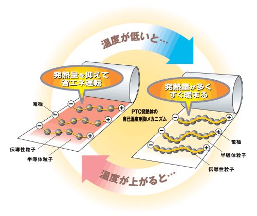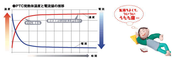 温度が高くなるにつれて電気抵抗が大きくなる、PTC(Positive Temperature Coefficient=正温度係数)の特性を利用して開発されたPTCヒーター。 発熱体自身が自己温度に反応して通電量を自動制御しながら暖めますから、少ない電気量で、快適・安全性の高い床暖房を実現します。