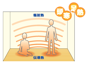 足元から直に暖める伝導熱と床面からの輻射熱(遠赤外線)により体を芯から暖めます。「頭寒足熱」の床暖房は、お年寄りや冷え性、腰痛の方にも、嬉しい暖かさです。